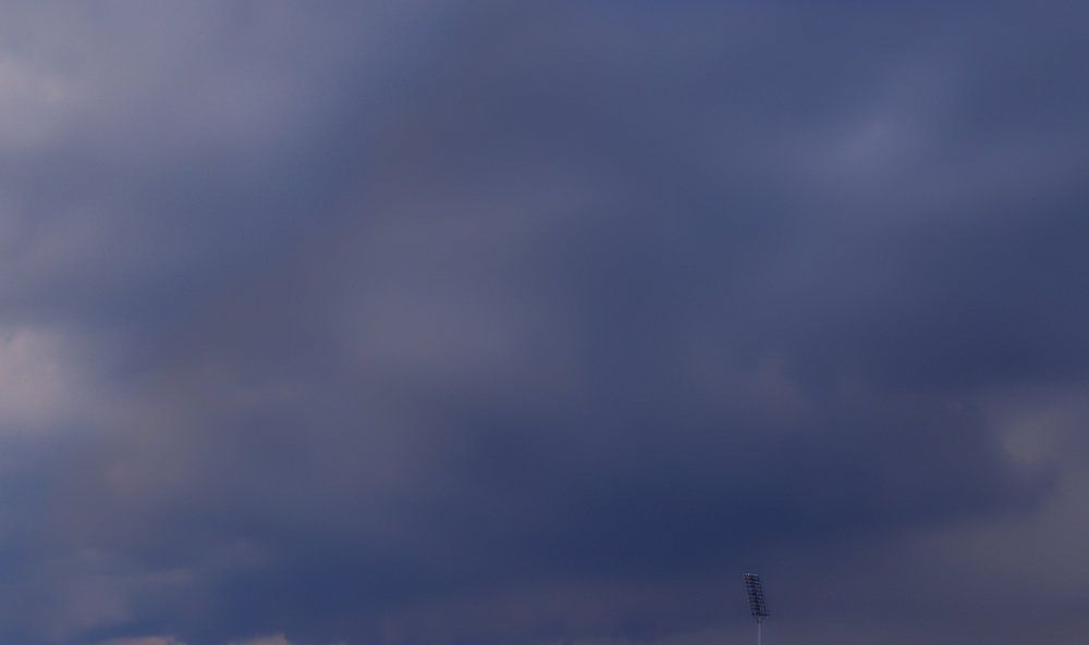 Panoramafoto bestaande uit 2 foto's gemaakt met de Lumix GF7K dus geen Exif-bestanden. Donkere wolken boven de Veltins Arena in Gelsenkirchen