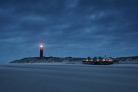 's Morgens vroeg, voor zonsopkomst, tijdens het blauwe uurtje in stormachtige wind en een leeg strand de vuurtoren Eierland en het strandpaviljoen gefotografeerd op het waddeneiland Texel.