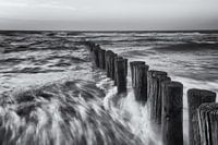 Deze foto is gemaakt in maart 2024 tijdens windkracht 7 op het strand van Burgh-Haamstede. De harde wind zorgde voor veel golfslag. Bij een lange sluitertijd resulteert dit in veel beweging in het water rond de palen.