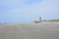 Een stormachtige dag en opstuivend zand op het brede strand van Texel bij de vuurtoren