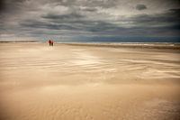 Eenzaam paar tijdens een wandeling met onweer op het zandstrand bij eb, Oost-Fries eiland Spiekeroog, Nedersaksen, Duitsland, Europa | paar maakt een wandeling op het strand bij eb kort voor een onweersbui, Oost-Fries eiland Spiekeroog, Nedersaksen, Duitsland