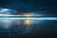 Stormachtige zee, golven en schuim na een onweersbui bij zonsondergang. Marina di Cecina strand, Tyrreense Zee, regio Toscane, Italië, Europa.