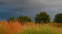 Een krachtig natuurbeeld waarin de dreiging van een naderende storm contrasteert met de warme gloed van het grasland. De rood-oranje halmen vangen het laatste licht, terwijl de donkere wolken boven de groene bomen een dramatische sfeer oproepen. Deze compositie vangt het moment waarop stilte en spanning samenkomen in het landschap.