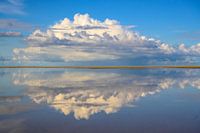 Stormwolk nadert het eiland Texel boven de Noordzee bij het Noordzeestrand van het eiland. De wolken worden weerspiegeld in het water op het strand dat achterblijft na vloed.