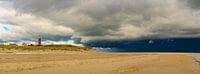 Stormwolk nadert over het strand van Texel op de noordpunt van het eiland bij de vuurtoren en met uitzicht op de Waddenzee en Vlieland. Wijde panoramafoto.