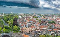 Stormwolken boven de binnenstad van Zwolle tijdens een zomerse onweersbui aan het einde van een warme en vochtige zomermiddag. Een shelfcloud nadert over de daken in de binnenstad. Er is een code oranje waarschuwing uitgestuurd door het Koninklijk Nederlands Meteorologisch Instituut (KNMI).