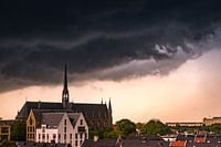 Onweerswolken boven Zwolle tijdens een zomerse onweersbui aan het einde van een warme en vochtige zomermiddag. Een shelfcloud nadert over de daken en het Dominicanenklooster in Assendorp.