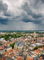 Stormwolken boven de binnenstad van Zwolle tijdens een zomerse onweersbui aan het einde van een warme en vochtige zomermiddag. Donkere regenwolken naderen over de daken in de binnenstad.