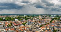 Stormwolken boven de binnenstad van Zwolle tijdens een zomerse onweersbui aan het einde van een warme en vochtige zomermiddag. Donkere regenwolken naderen over de daken in de binnenstad. Weids panoramisch uitzicht van bovenaf.
