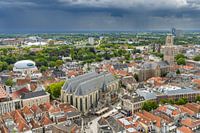 Stormwolken boven de binnenstad van Zwolle tijdens een zomerse onweersbui aan het einde van een warme en vochtige zomermiddag. Donkere regenwolken naderen over de daken in de binnenstad.
