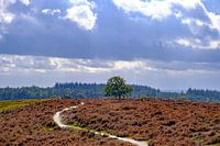 Stormwolken boven de heide en het bos in het natuurgebied Archemerberg in Overijssel tijdens een stormachtige herfstdag.