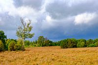 Stormwolken boven de heide en het bos op de Lemelerberg in Overijssel tijdens een stormachtige herfstdag.
