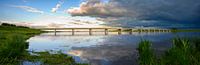 Onweerswolken boven de vaarweg Reevediep bij Kampen in de IJsseldelta. De arcuswolk met donder en bliksem beweegt zich snel over het groene landschap.