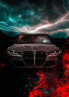 Een agressief, frontaal zicht op een moderne BMW M3/M4 met zijn prominente nierengrille. Op de achtergrond een opvallend beeld van groen-witte bliksemschichten boven de bergen en rode vlammen eronder.