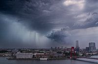 Deze snapshot legt een pittig stukje Rotterdam vast tijdens een knallende storm. Van bovenop een dak in de stad, krijg je een blik op de actie terwijl de skyline en de natuur met elkaar in de clinch liggen.