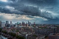 Deze snapshot legt een pittig stukje Rotterdam vast tijdens een knallende storm. Van bovenop een dak in de stad, krijg je een blik op de actie terwijl de skyline en de natuur met elkaar in de clinch liggen.