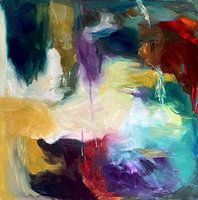 Een dynamisch vrij spel in kleur en vorm, spelen met vlakken en contrasten. Het originele werk is gemaakt met olieverf op canvas, de penseelstreken blijven herkenbaar in de afdruk.