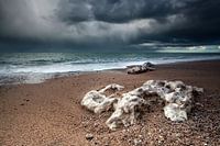 Dramatische stormachtige lucht boven rotsachtige strand in de Atlantische oceaan, Etretat, Frankrijk