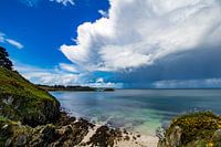 Langs de noordoostkust van Belle Ile en Mer trekken stortbuien over zee, op een kraakheldere dag in het voorjaar. Midden in beeld is het schiereiland de Gros Rocher, waarop een oud fort gevestigd is.