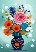 Dit ontwerp heeft een levendig en gestileerd bloemstuk in een donkerblauwe vaas tegen een zachte, lichtblauwgroene achtergrond. De bloemen zijn afgebeeld op een vereenvoudigde, bijna illustratieve manier met felle kleuren en ronde vormen. Dominant zijn de grote, oranje klaproosachtige bloemen met een zwart hart en gestructureerde bloemblaadjes, een grote roze bloem met lagen concentrische cirkels en clusters van kleinere gele en blauwe bloemen. Witte accenten geven accenten en diepte. De vaas, versierd met oranje en gele cirkels, vormt een sterk contrast met de lichtere achtergrond en verbindt het kleurenschema. Het geheel oogt vrolijk, modern en licht abstract.