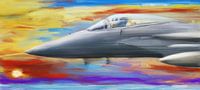 Een straaljager die op volle snelheid vliegt met een kleurrijke lucht als achtergrond. De piloot lijkt naar de zon te kijken die onder de horizon gaat. De geel oranje zonsondergang kleurt de wolken achter de F-35.