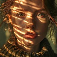 Dit indrukwekkende portret van een vrouw vangt de betoverende effecten van licht en schaduw die een geometrisch patroon op haar gezicht werpt. De warme stralen en intense schaduwen geven het beeld een levendige en diepe sfeer. Perfect voor liefhebbers van artistieke en sfeervolle fotografie die de magie in het samenspel van licht en…
