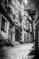 Verstild straatbeeld in zwartwit met kinderkopjes, vakwerkhuizen en bloembakken in het middeleeuwse wijndorp Eguisheim. Regio Elzas, Frankrijk. Reisfotografie