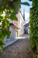 Straat met een kerktoren en groene klimop in de stad van Tallinn, Estland. Stadsfotografie en straatfotografie.