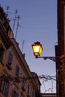 Straat lantaarn in Rome tijdens een onbewolkte nacht met de maan op de achtergrond in de lucht. Tussen typische gebouwen uit de stad.