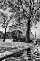 Mooie weerspiegeling van de Eiffeltoren in de plas in smaakvol zwartwit tinten.