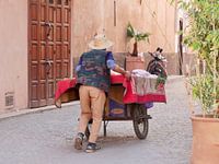 In het altijd drukke en hectische Marrakech fotografeerde ik deze man met zijn kar. De kar lag vol tomaten die hij richting de medina bracht. Dit beeld is karakteristiek voor Marrakech, waar je voortduren mensen met dit soort karren ziet rondlopen.