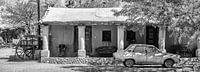Zwart/wit foto van een straatbeeld in het noorden van Argentinië met een oude renault.