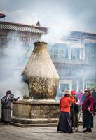 Straatbeeld in Lhasa, Tibet. Op het grote plein in het centrum van Lhasa, wordt op verschillende plaatsen wierook gebrand in grote ovens. De vrouwen dragen kleurrijke kleding en traditiegetrouw een hoed. Velen lopen met gebedsmolens of gebedskralen. Een rondgang om het klooster hoort bij de dagelijkse bezigheden.