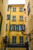 Straatbeeld in Vieux Nice, Frankrijk tijdens een zomerse dag. Nice ligt aan de Franse Rivièra, de zuidoostkust van Frankrijk aan de Middellandse Zee, aan de voet van de Franse Alpen. Het is de op één na grootste Franse stad aan de Middellandse Zee en de op één na grootste stad in de regio Provence-Alpes-Côte d'Azur.