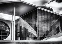Een man ligt alleen op de trap van het Marie-Elisabeth-Lüders-Haus aan de oever van de Spree. Straatfotografie uit Berlijn in zwart-wit.