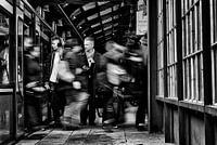 Een voorstadstrein is aangekomen op het station. Passagiers verlaten haastig de trein terwijl anderen wachten om in te stappen. Straatfotografie uit Berlijn in zwart-wit.