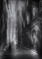 Een koppel loopt alleen door een smal steegje in de oude stad van Lucca, Toscane. Op de achtergrond de kathedraal van San Martino. Fine art straatfotografie uit Italië in zwart-wit.