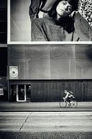 Straatfotografie in Utrecht. De fietser in de Lange Viestraat. Deze foto van de Utrechtse fotograaf André Blom stamt uit begin 2019 en werd gemaakt t.b.v. een expositie over mensen die onderweg zijn in de stad. Te voet of per fiets. Gejaagd, gehaast of juist rustig aan.