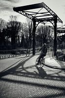 Straatfotografie in Utrecht. De fietser op de Muntsluisbrug. Deze foto van de Utrechtse fotograaf André Blom stamt uit begin 2019 en werd gemaakt t.b.v. een expositie over mensen die onderweg zijn in de stad. Te voet of per fiets. Gejaagd, gehaast of juist rustig aan.