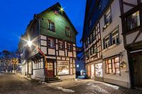 Het pittoreske dorpje Monschau tijdens het blauwe uurtje in de Duitse Eifel. Door zijn mooie gerestaureerde oude vakwerkhuizen, waan je je in een sprookjes landschap. Een laagje sneeuw maakt het een magische tafereel.