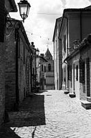 Straatje in een Italiaans bergdorpje in de Marche. De foto heeft een mooie korrel en is uitgevoerd in zwartwit.