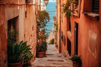 Tussen zachte, terracottakleurige muren slingert een smal steegje zich een weg naar het glinsterende blauw van de zee. Weelderige planten in kleipotten voegen levendige accenten toe aan het landschap, terwijl een smalle lichtstraal het pad verlicht. Een lucht van niet-shell en mediterrane flair verspreidt zich, uitnodigend om te ontdekken en te blijven hangen.