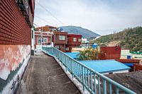 Straatjes met gekleurde huizen en muurschilderingen in de Gamcheon Culture Village wijk van Busan in Zuid Korea. Gelegen op een berg met kleine zigzaggende straatjes naar boven en beneden.