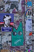Straatkunst met graffiti, posters en stickers op Brick Lane, Bangla Town, Londen, Verenigd Koninkrijk.