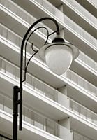 Zwart-witfoto van een straatlantaarn op de strandboulevard van de stad Swinoujscie aan de Poolse Oostzeekust. Op de achtergrond de gevel van een adellijk hotel direct aan de kust.
