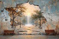 Dit urban street art schilderij toont een sfeervolle stadsscène waarin een waterval het einde van de straat verlicht, zichtbaar door een verweerde muur. De compositie voelt dromerig en poëtisch aan, met warme aardetinten en een zacht gouden licht dat rust en verwondering oproept.