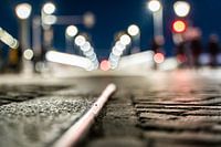 De verlichte straatverlichting van de moderne stadsbrug in de oude hanzestad Kampen aan de IJssel in Overijssel. Sfeervolle avond foto met onscherpe achtergrond en zachte focus op straatwerk met reflectie van de verlichting door de regen.
