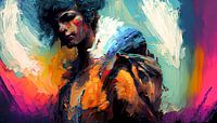 Bonte penseelstreken met sterk contrast om mannelijke figuur in levendige kleuren en donkere contouren.