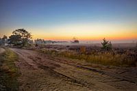 Mistige zonsopkomst op de Strabrechtse Heide bij Heeze (Noord-Brabant, Nederland)