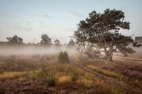 Zonsopkomst in de mist op de Strabrechtse Heide bij Heeze (noord-Brabant, Nederland)